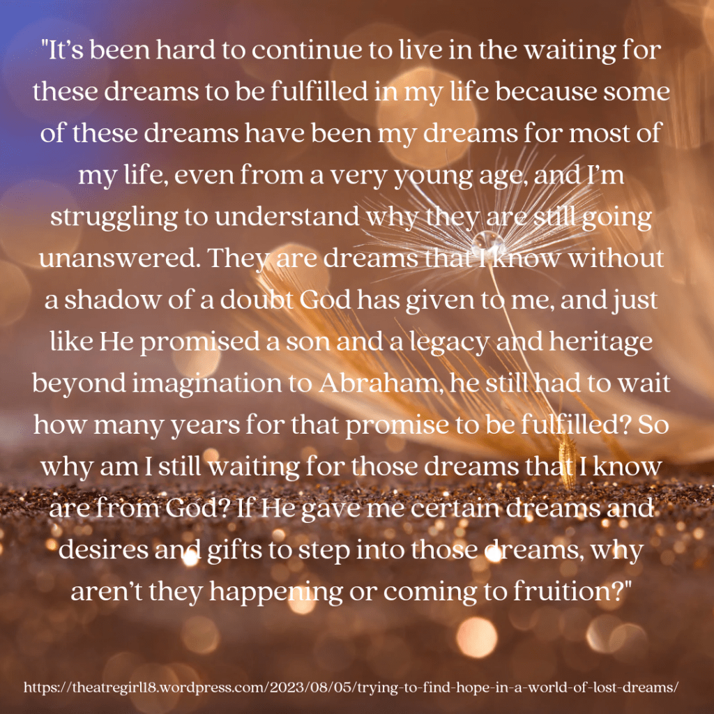It’s been hard to continue to live in the waiting for these dreams to be fulfilled in my life because some of these dreams have been my dreams for most of my life, even from a very young age, and I’m struggling to understand why they are still going unanswered. They are dreams that I know without a shadow of a doubt God has given to me, and just like He promised a son and a legacy and heritage beyond imagination to Abraham, he still had to wait how many years for that promise to be fulfilled? So why am I still waiting for those dreams that I know are from God? If He gave me certain dreams and desires and gifts to step into those dreams, why aren’t they happening or coming to fruition?