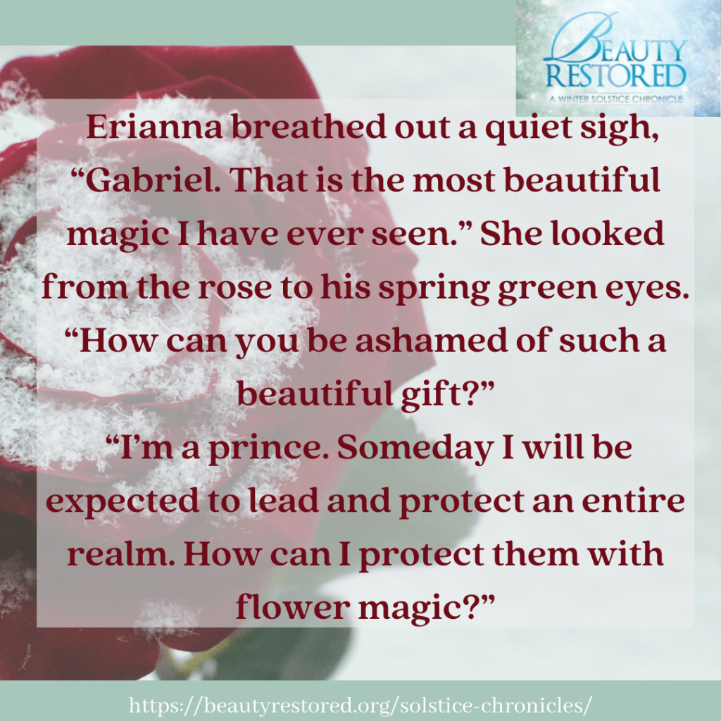 Gabriel’s magic helps his realm thrive and brings beauty to his realm, but he views his magic as weak and a poor expression of what a strong Prince is supposed to look like. When he demonstrates his magic for Erianna and draws a beautiful rose out of the cold hard earth of the Winter realm, Erianna is in awe of his ability to bring life from something so hard and lifeless. Often times music or the arts are viewed as weak or not a strong gift for men and being viewed as caring or gentle is viewed as the opposite of masculine. In my stories, the male characters have gifts of music or flowers or different things like that, but they are strong, valiant warriors as well who seek to protect their realms, their families, and the women that have been placed in their lives. They show strength in emotion and their gentleness does not detract from their power and strength. David in the Bible was a poet and a musician, but he also was a protective shepherd who defended his sheep, killing lions and bears with his bare hands, stood up to a giant that threatened the character of his God, and went onto lead as a mighty warrior king. He cried. He laughed. He experienced great sorrow but also great moments of joy and dancing. He was not a weak king and that’s what I wanted to portray in Gabriel and the male characters in these books. And the women are not weak either, but there is strength in both male and female characters and strength in serving and ruling and protecting when done together.