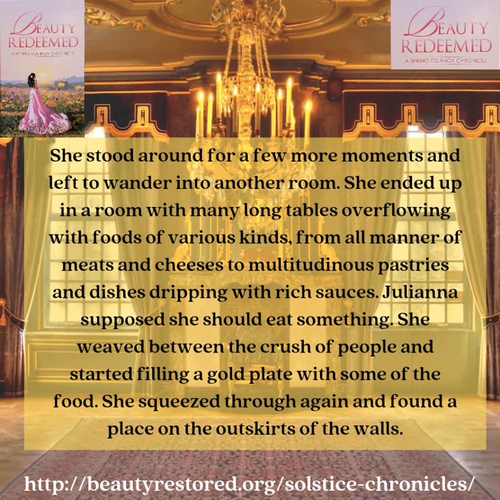 Julianna wandered the halls and stopped in various grand rooms for a few minutes. It seemed like there were many more people than had been at previous parties. She had no idea how many of these people had become residents here or how many had been invited in just for the party tonight. Julianna stopped in the main ballroom and stood as much out of the way as possible. She watched as people ate and drank and carried on like they didn’t have a care in the world. She didn’t know how long she would be here but she hoped she would never become that careless and absorbed into the things of this manor. She stood around for a few more moments and left to wander into another room. She ended up in a room with many long tables overflowing with foods of various kinds, from all manner of meats and cheeses to multitudinous pastries and dishes dripping with rich sauces. Julianna supposed she should eat something. She weaved between the crush of people and started filling a gold plate with some of the food. She squeezed through again and found a place on the outskirts of the walls.