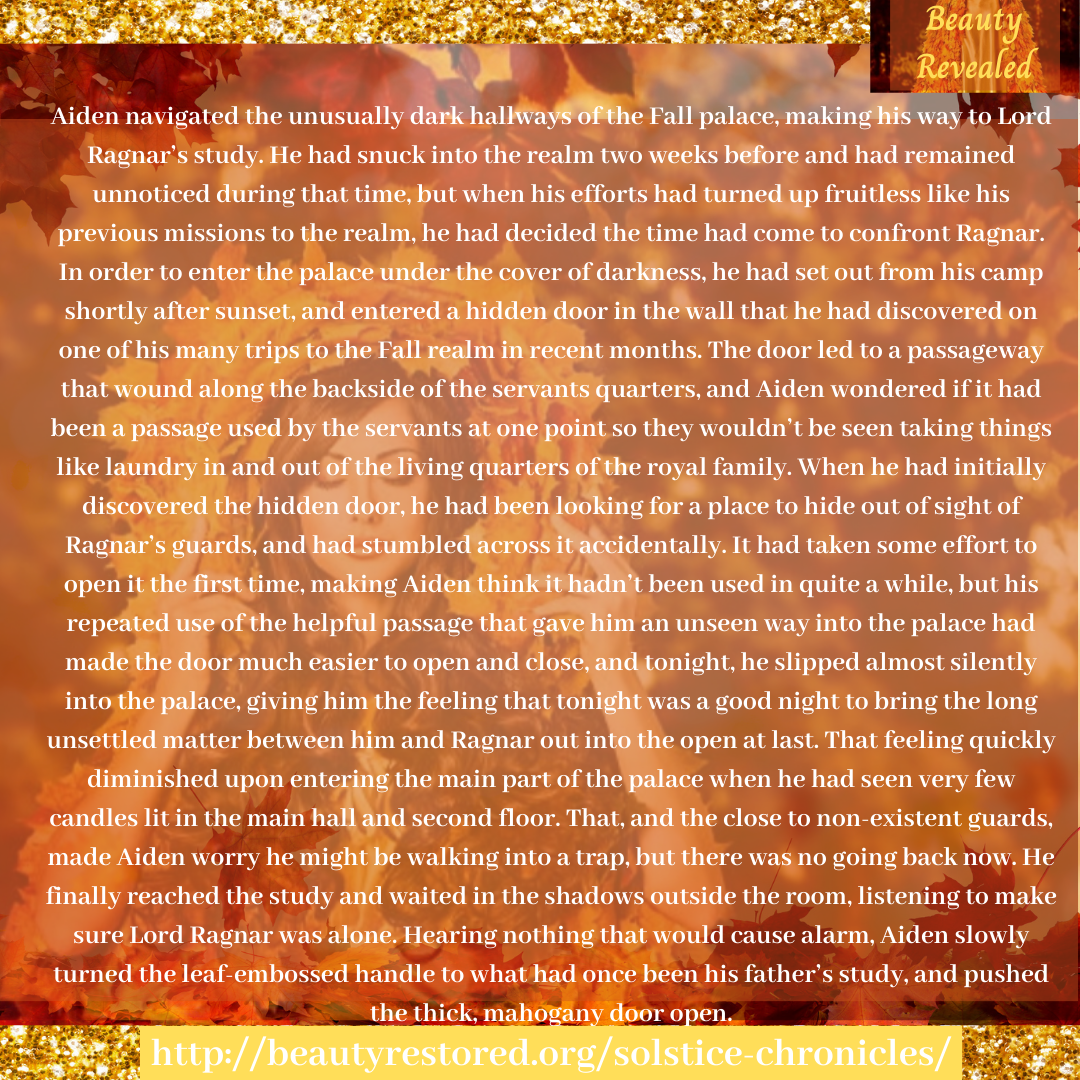 Chapter 1 Aiden navigated the unusually dark hallways of the Fall palace, making his way to Lord Ragnar’s study. He had snuck into the Fall realm two weeks before and had remained unnoticed during that time, but when his efforts had turned up fruitless like his previous missions to the realm, he had decided the … Continue reading Beauty Revealed Preview Chapter