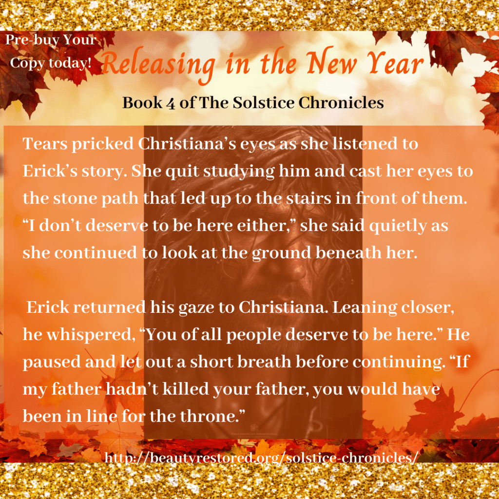 The scene shared at the beginning of this post is taken from the end of the book when Erick and Christiana return to the Fall palace in Havilah. They both face their own struggles with feeling unworthy for returning to the palace in Havilah because of choices both of them made that brought harm to the realms and the people around them. They are both more than understanding if those they hurt turned their backs on them and never wanted to see them again. But graciously, they are both given a second chance and shown an abundance of love and mercy and brought into the family they’ve both longed to be a part of for their entire lives.