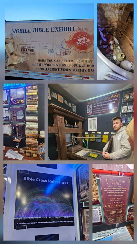 I’ll start by sharing that an event popped up on my Facebook several weeks ago for a mobile Bible exhibit that was going to be in Colorado. I’ve included a link to their website below. It talks about their mission and shares where they’ll be next. Because of my interest in the Bible and the history it holds not only for personal enrichment, but because that’s the center of my Heart of God series, I was very interested in checking out this little Bible exhibit. I told my mom about it but it was only at a church in Colorado for a week. Life got busy and we didn’t end up making it there. By God’s grace, another event popped up on my Facebook for another location in Colorado last week at a church that was five minutes from my house. You can’t get much better than that. My mom and I went last week and were truly amazed by the exhibit. Truth be told, we didn’t know what to expect. I was sure whatever information or artifacts they had in their little exhibit would be interesting, but how much can you fit into a converted semi-truck trailer in the parking lot of a church? Well, we discovered a wealth of information and many various artifacts that showcased different aspects of the viability and importance of the Bible and were pleasantly surprised by our informative and interactive guided tour of this little exhibit. We were both so impressed and impacted, I put together a post to share on all my socials as well as sharing with friends and family. The exhibit is truly incredible and I’m so glad God provided another opportunity for us to go see it. We even had the privilege of going again last night with my dad and we got the perspectives of the other 2 guides that are on this particular tour of the mobile Bible exhibit, which made it even more interesting to hear what different things impact each of them and what each of them like to share about. Seeing the exhibit not once, but twice, inspired me to share some of my thoughts of things I was reminded of about the Bible as well as new things I learned about this incredible book, so here are my takeaways from the exhibit.