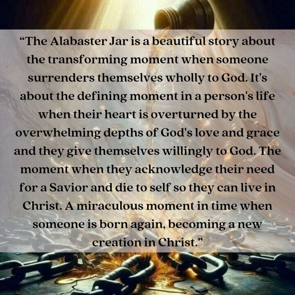 The Alabaster Jar is a beautiful story about the transforming moment when someone surrenders themselves wholly to God. It’s about the defining moment in a person’s life when their heart is overturned by the overwhelming depths of God’s love and grace and they give themselves willingly to God. The moment when they acknowledge their need for a Savior and die to self so they can live in Christ. A miraculous moment in time when someone is born again, becoming a new creation in Christ. This moment is a strange and wonderful moment in a person’s life that unless one experiences this transforming moment, it is hard to explain or understand. In that moment, you realize so many things. You realize that you are in fact a sinner and you can’t get to Heaven in your own merit. You realize the penalty for sin is death and eternal separation from the God and Creator of the Universe and nothing you do on your own is going to bridge that gap between you and the Almighty God. You also feel this overwhelming sense of gratefulness and humility because you suddenly realize that Christ was the only One who could bridge the gap between you and God and that He willingly left His throne in Heaven to come to earth as a human being and later died a horrible death on a cross that He did not deserve because He loved YOU too much to live the rest of eternity without you by His side in Heaven. You realize every wrongdoing, ever evil or selfish thought, every prideful or vengeful decision, every moment of choosing something other than Him, has been completely covered in the sacrifice of Christ’s blood on the cross and your heart, mind and soul have been washed completely clean. You have undeservingly been made white as snow and pure in your life and you know in that moment that your life will never be the same again. This moment is what the woman in the story of the Alabaster Jar experienced when she came before Jesus as He dined at a Pharisees home and poured out her heart, soul and mind–all her years of sin and living as a fallen and broken woman, all her years of bad mistakes and decisions– in the physical act of pouring out an expensive jar of perfume–the most treasured thing she owned– at the feet of Jesus.